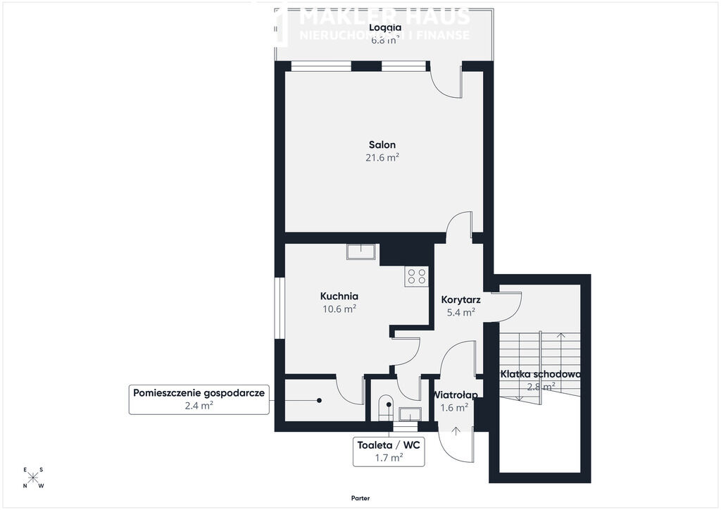 - parter : salon 21,60 m2 z wyjściem na loggię 6,80 m2, oddzielna