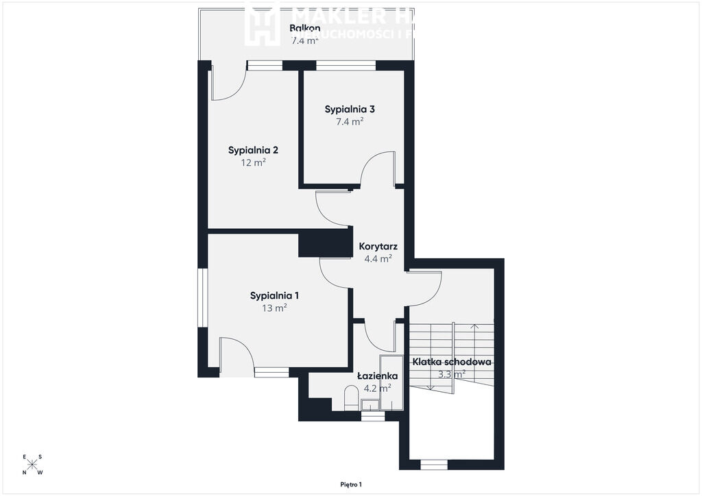 - I piętro : 3 sypialnie, balkon, łazienka, przedpokój i klatka